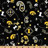 , The University of Iowa Hawkeyes cotton broadcloth fabric features a bandana design with the University logo school colors include black and gold. Use in quilting craft projects apparel decorating dorm rooms and home decor accents. (Read More)