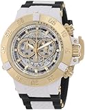 Invicta 928, Plasctic case with a black and white polyutherane bracelet. Gold tone bezel. Transparent dial with gold tone hands and index hour markers. Minute markers. Dial Type: analog. Luminiscent hands and markers. Date display at the 4 o'clock position. Three sub-dials displaying: 30 minutes and 60 seconds, 1/10th of a second. Quartz movement. Scratch resistant flame-fusion crystal. Screw down crown. Case diameter: 50mm. Case thickness: 17mm. Band width: 28mm. Tng clasp. Water resistant at 200 meters / 660 feet. Functions: chronograph, tachymeter. Sport watch style. Invicta Subaqua Noma III Chronograph Mens Watch 0928. (Read More)