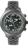 Timex T2N614, Casual watch, Quartz movement, Multifunction featuring 24-hour world time and season (differentiates between Standard/Daylight Saving Time) subdials, Analog world time function displays current time in 24 cities, Home time zone setting, Polished silver-tone sword hands and sweep seconds with additional fourth world time hand, Polished silver-tone hands mark subdials, Applied polished silver-tone Arabic numbers mark twelve, two, six and eight o'clock, Applied polished silver-tone baton markers, White print/Arabic numbers mark subdials, White indices form surrounding ornamental minute track, City names mark outer concave ring, INDIGLO® night-light, Analog date aperture at three o'clock, Brushed charcoal dial with polished black globe graphic and polished white logo applique at two o'clock, Brushed black stainless steel bracelet with polished inserts, adjustable links and push-button-clasp, Brushed/polished black stainless steel round case, Textured black steel crown with engraved globe graphic, Polished black steel selector buttons, Stainless steel caseback, Mineral crystal, 100 meters/330 feet water resistant ...